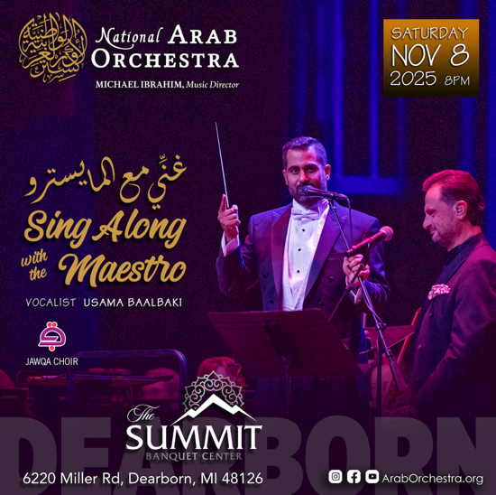 Join the National Arab Orchestra for a unique community experience in Dearborn, Michigan. Sing-Along with the Maestro, directed by Maestro Michael Ibrahim, invites audiences to become part of the performance in an evening that blends tradition, joy, and collective expression. Featuring vocalist Usama Baalbaki, members of the NAO, and the community choir Jawqa, directed by Lubana Al Quntar, this interactive program highlights beloved songs from across the Arab world. With projected lyrics and live accompaniment, audiences are encouraged to sing together – celebrating the shared cultural heritage that unites generations.
